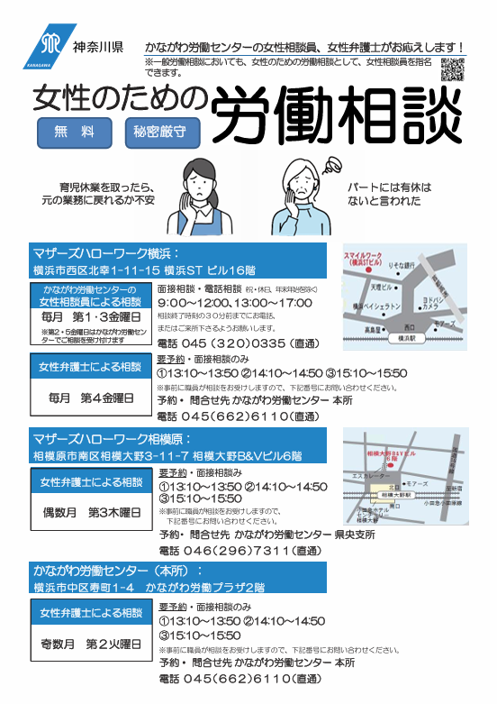 ホーム > 産業・働く > 労働・雇用 > 労働関係・労働相談・外国人労働者支援 > かながわ労働センター総合案内 > 職場の悩みを相談したい方へ > 女性のための労働相談