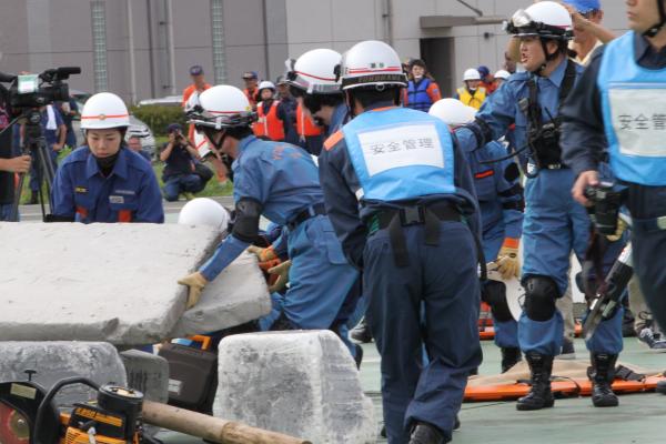 男性消防団員の多くが不在の平日昼間の地震発生を想定し、女性消防団員のみで、情報収集・避難広報訓練、津波避難訓練、倒壊家屋・ガレキからの救助訓練、放水訓練のデモンストレーションを行いました。