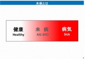 だから医療を守るためにも、社会保障のシステムを守るためにも今から変えなければいけないということです。そのためのキーワードが「未病」ということですね。健康ですか、病気ですかといって、病気になってから治すというのが普通のモデルですけれども、このモデルを続けていたら崩壊します。だから未病から改善していく。未病とは何ですか、と言ったら、健康と病気の間はこのようにグラデーションで変化する。むしろこの方が皆さんの実感ですよね。健康ですか、病気ですか、どっちですか、というよりも、何となく具合が悪いなと、この間を行ったり来たりしているというのが人間ですよね。これを少しでも白い方へ白い方へ持って行こうとすること、これが未病を改善するということですね。これをやっていくことによって、病気にならなくするという。これが一番大事だということです。健康な時代を長くしていこう、健康寿命を伸ばしていこうということでありますね。