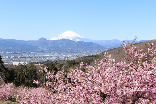 富士山や足柄平野を背景に高台から望む早咲き桜は、まさに絶景です。