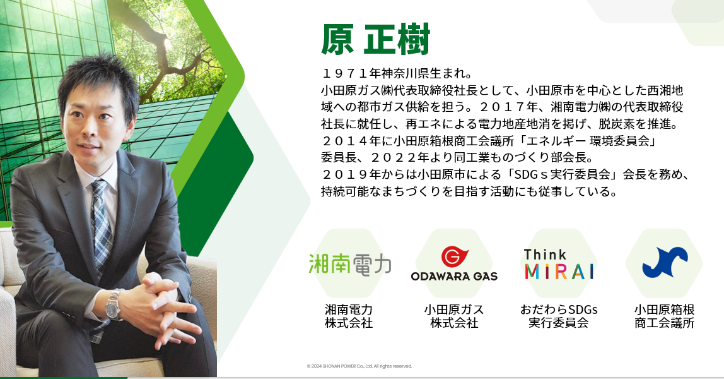 はじめに、湘南電力株式会社 代表取締役社長 並びに、おだわらSDGs実行委員会 会長 原 正樹様をご紹介します。
