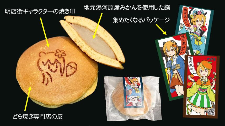 どら焼き専門店の職人が1枚1枚丁寧に焼いた皮に商店街キャラクターを彷彿させる焼き印をいれ、地元湯河原産みかんを使ったこだわりのみかん餡を挟んだスイーツどら焼き。商店街キャラクターを起用したパッケージは集めたくなってしまう3種類をご用意。