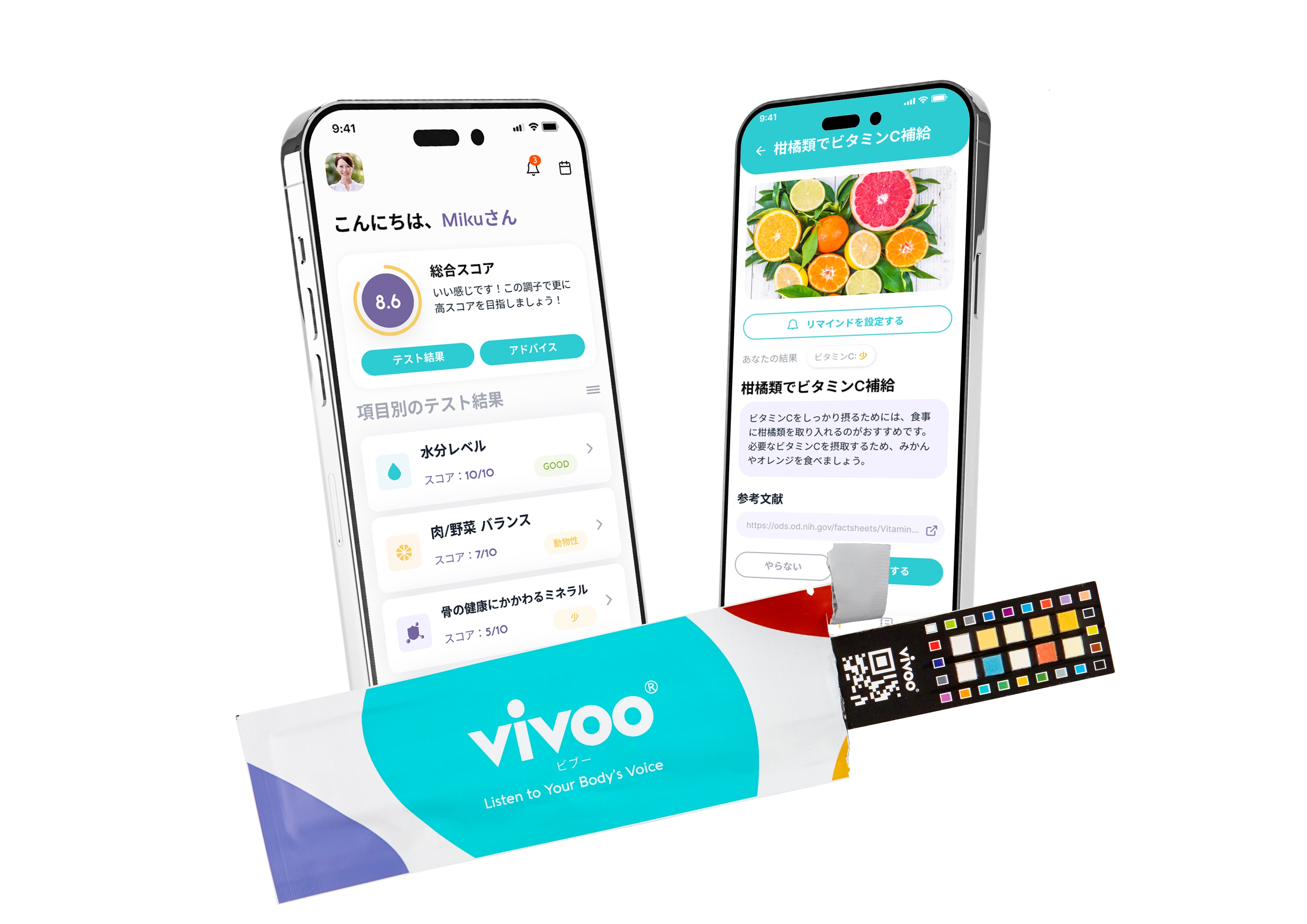 | 11 | Vivoo(ビブー) | 大塚製薬株式会社 | 尿 | 栄養状態(水分レベル、食塩摂取量、肉・野菜 バランス、ビタミンC、骨の健康にかかわるミネラル、酸化ストレス) | ![]() |