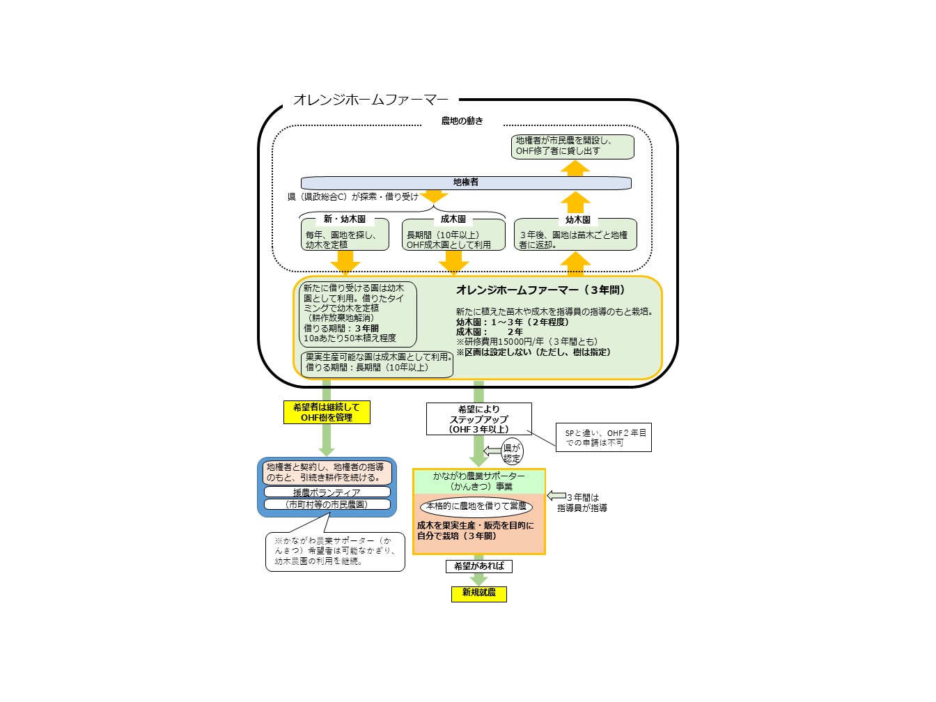 オレンジホームファーマーとして3年以上耕作実績があり、オレンジホームファーマーより広い農地(1000平方メートル程度)で本格的な農業に取り組む意欲と能力がある方は「かながわ農業サポーター(かんきつ)」に申請することができます。