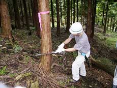 | ロープで引いて木を倒します | 森の大切さや機能を学びました |