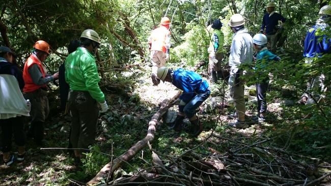 水源林の大切さを実感していただいた後、落ち枝や倒木の整理を行いました。