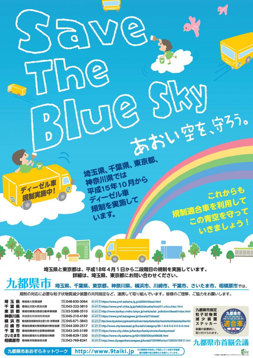 自動車排出ガスによる大気汚染を改善するため、九都県市(埼玉県、千葉県、東京都、神奈川県、横浜市、川崎市、千葉市、さいたま市、相模原市)では、一都三県の条例により、平成15年10月から粒子状物質の排出基準を満たさないディーゼル車の運行を禁止しています。
