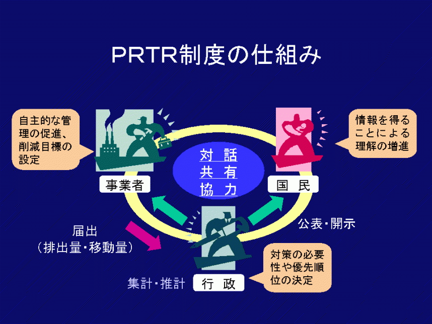 化管法に基づき、人の健康や生態系に有害なおそれのある化学物質について、事業所からの環境への排出量及び事業所外への移動量を事業者が自ら把握し国に届け出るとともに、国は届出データや推計に基づき、排出量・移動量を集計し、公表する制度です。