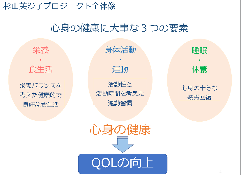 今日はトップアスリートを育てる話ではなく、生涯スポーツについてお話していきます。私は、子ども、親、アスリート、コーチ、そして予防医学、心身の健康や、女性の社会環境、そして、スポーツ環境について、いろいろな活動に関わっています。心身の健康に大事な3つの要素は、栄養・食生活、身体活動・運動、そして、睡眠・休養、これらのバランスが取れると心身が健康になり、QOL(生活の質)が向上します。