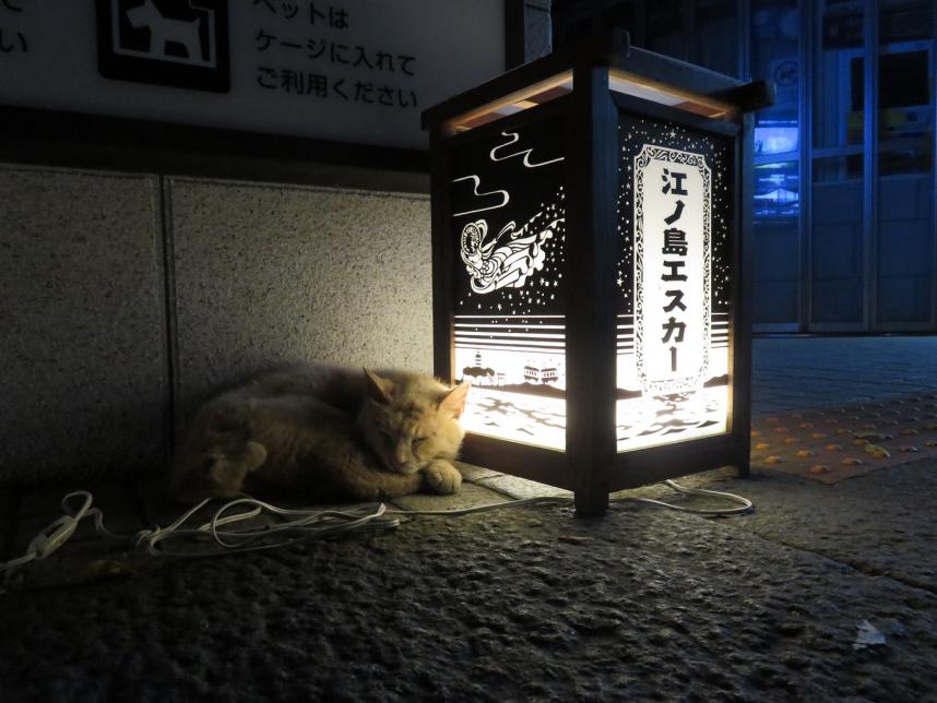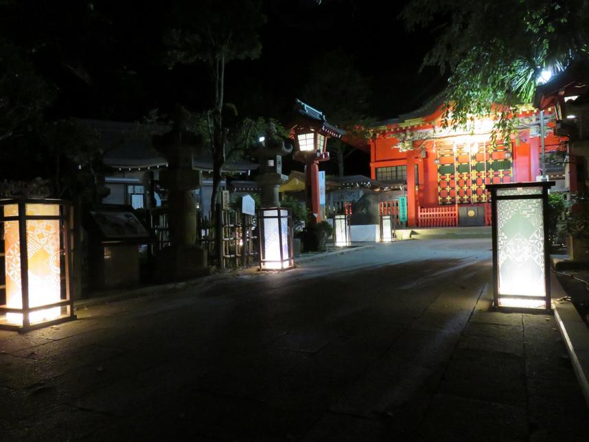 日没後。江の島弁財天仲見世通りから江島神社へと向かいます。商店街の店々の軒先には行灯が点っています。