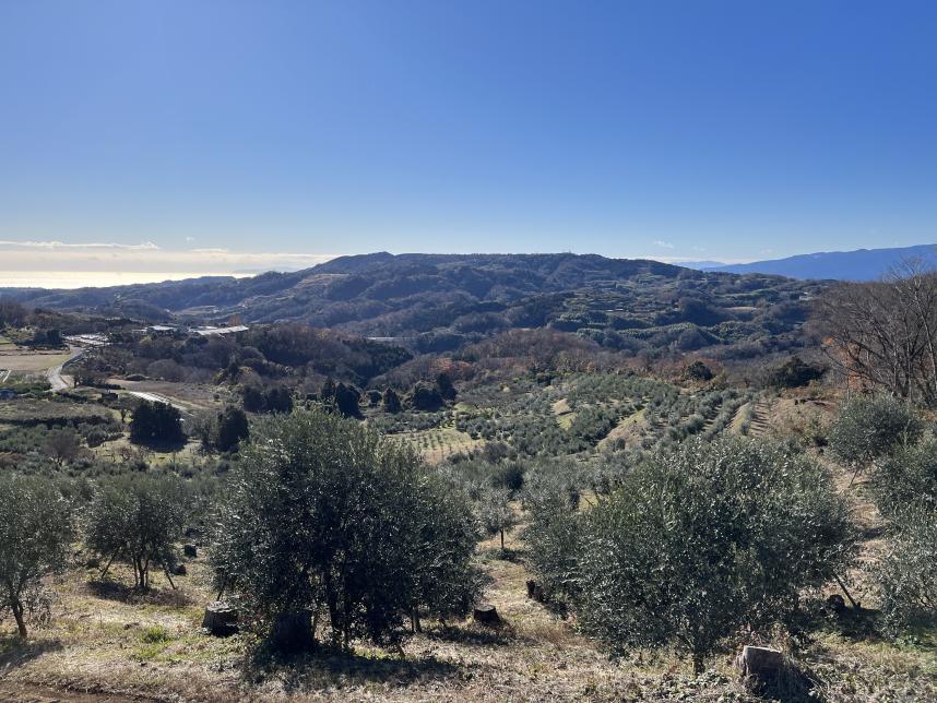 オリーブ農場からは、相模湾や富士山をみることができ、眺望が素晴らしかったです。上の写真は、農場の外から撮影したもので、オリーブ畑の奥にきらきらとしている相模湾を望むことができます。普段は農場内に入ることはできませんが、このように農場の外からもきれいな景色が見えますので、足を運んでみてはいかがでしょうか。
