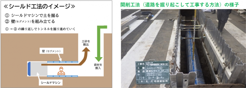 これまで、口径の大きい管路の更新工事については、大規模かつ長期間の交通規制等を避けるため、道路を掘り起こさず、シールドマシンという機械を使って地中でトンネルを掘り進めながら工事を行う「シールド工法」を前提に費用の計算を行っていました。今回、次期経営計画期間の工事場所や工事内容について、個別に細かく見直しを行い、道路を掘り起こして工事することが可能な場所については、より安価な工法である「開削工法」を用いて、費用の再計算を行いました。