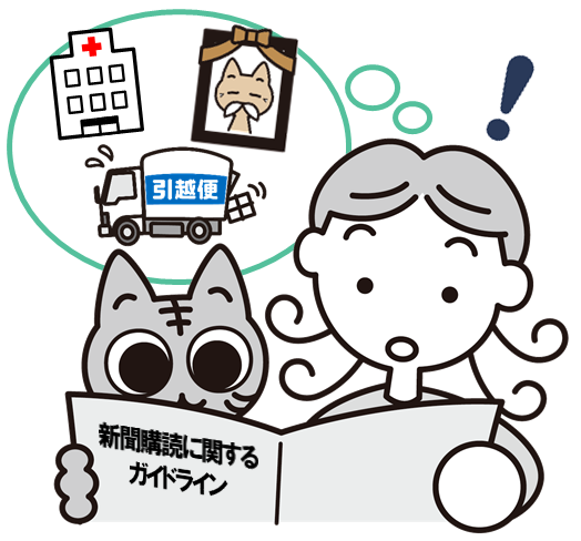 長期の契約などで契約期間が残っている場合、一方的に解約することはできないので、事業者との話し合いで解決していくことになります。業界団体の「新聞購読契約に関するガイドライン」では、病気や入院、死亡、転居など、新聞が読めなくなったような場合は解約に応じなければならない、と定めています。