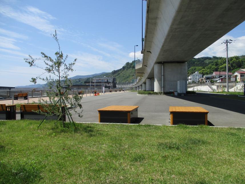 蓄養エリアでは、周辺住民との交流や地域振興のための来訪者受け入れ施設など、にぎわいの創出を目的に整備が進められ、平成30年度までに駐車場や多目的広場などの施設が完成しました。