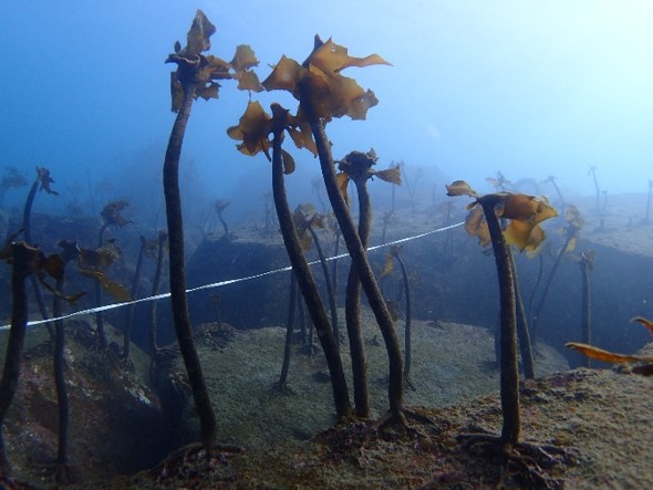 (海藻や魚介類の生息状況:左上からアワビ・サザエ、カジメ、イソモク)