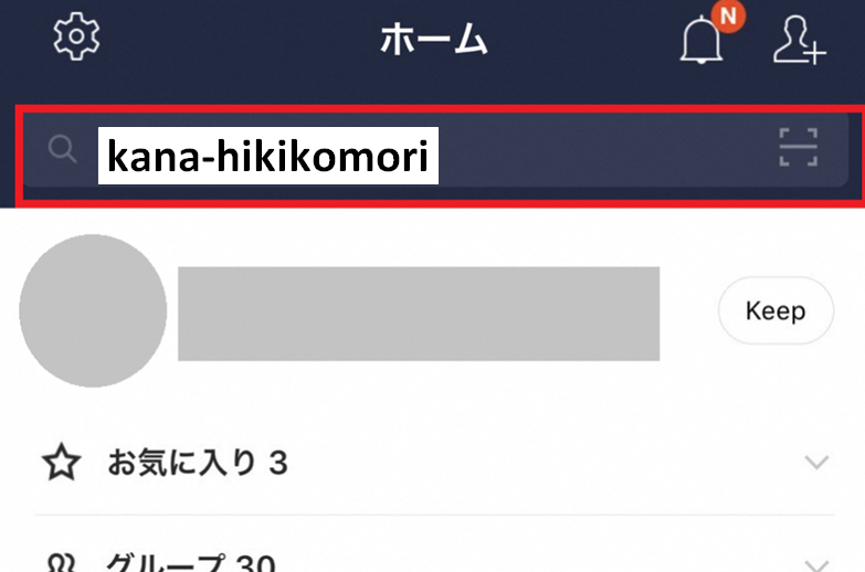 ・LINEアプリ「ホーム」の「検索」窓でID「kana-hikikomori」を入力。