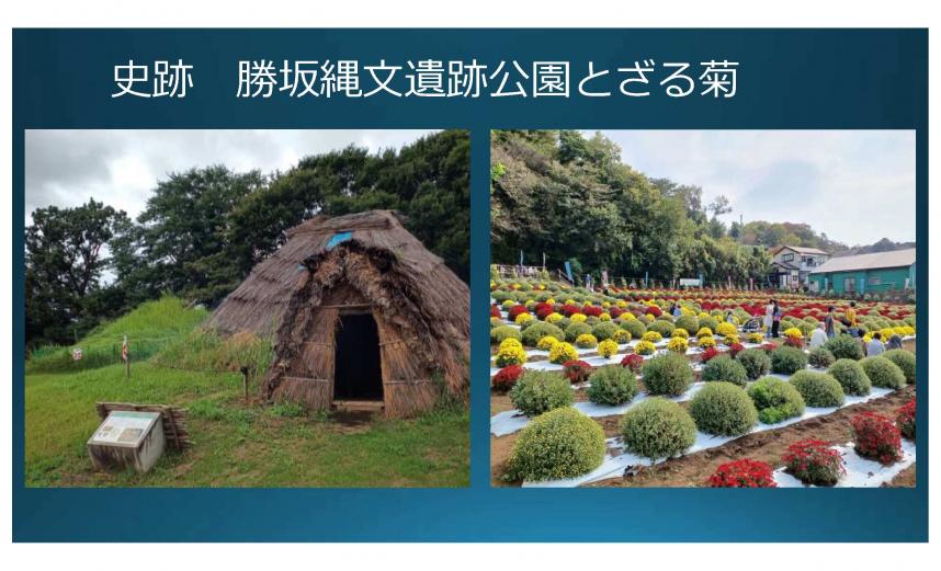 この新磯地区では縄文時代から人々が住んでいたということが、勝坂式土器の発見から証明されました。今は遺跡公園として一般の方も建屋などを見ることができますが、もう一つ、スライド右側の写真のざる菊が、勝坂地区の新しい名所となっています。先週16日の土曜日に縄文まつりが開催されました。ざる菊もちょうど咲き、綺麗な時期になっております。