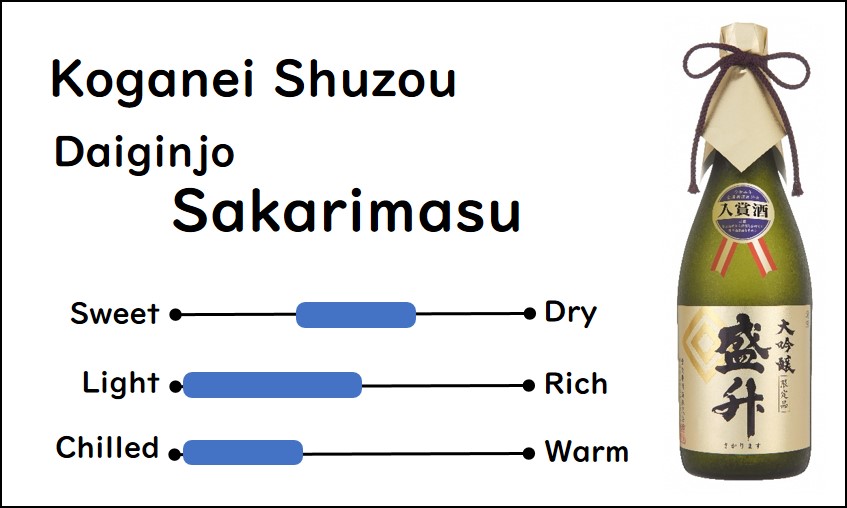 The brand “Sakarimasu” was named after the house “Masuya” and the expression “Masumasu Hanei” which means “greater prosperity” in Japanese. It is a fragrant Daiginjo made from 40% Yamadanishiki rice from Hyogo prefecture and is slowly fermented at low temperature.
