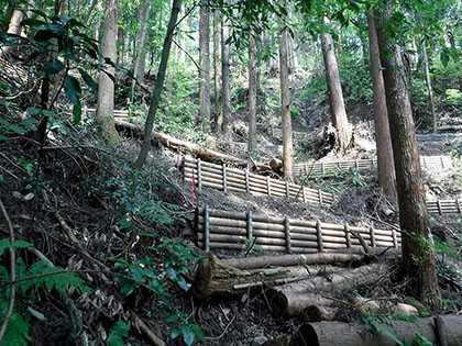写真の場所は、小さな土砂崩れがあった場所で、丸太積工で斜面の傾斜を緩やかにして土を安定させ、植物が生えやすくしています。