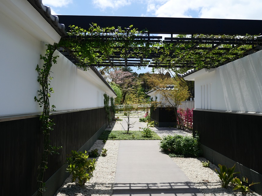 白壁や竹の垣根など、伝統的な日本の建築を感じさせる空間。