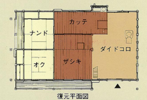 屋内は4室からなり、手前の板の間はイロリのある方がザシキ、座りナガシのある方がオカッテ、畳敷きの2ヘヤは左側がオク、右側がナンドと呼ばれます。
