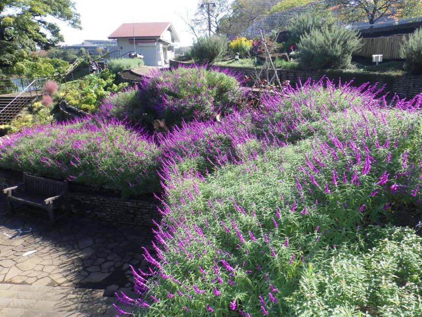 9月上旬の現地訪問でしたので、写真のように斜面がジニア(百日草)の花で埋め尽くされていました。ここから湖の方へ下っていくと、「湖畔テラス」があります。