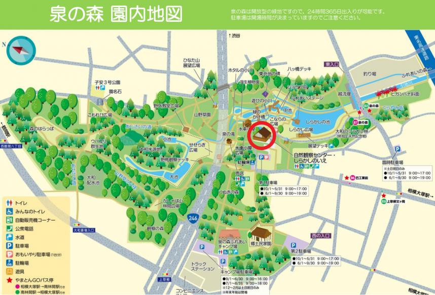 広大な広さの「泉の森」になりますが、この赤丸のところに「大和市自然観察センター・しらかしのいえ」があります。