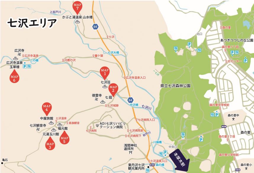 【交通アクセス】小田急小田原線「本厚木駅」厚木バスセンター9番バス乗り場から「七沢」行きバス乗車「七沢温泉入口」下車徒歩15分