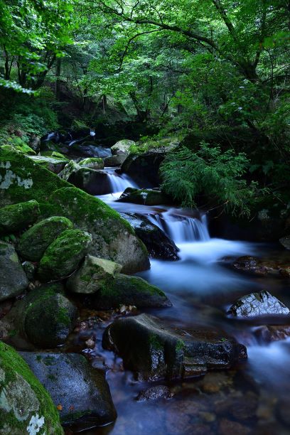 不動尻広場から滝に向かう途中、いくつもの岩の段差を水が流れる様子が見られます。水しぶきを眺めたり、水の流れる音に耳を澄ませたり、自然を満喫しながら歩くことができます。