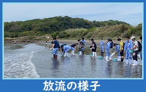 生物環境科では、地域の水産業への貢献として、漁協や神奈川県水産技術センター、神奈川県栽培漁業協会等とも協力をし、ヒラメ、アワビ、ナマコの種苗生産と放流を行っています。本校では、1月頃にふ化した仔魚を飼育し、4月末に放流することを目標に実習を行っており、令和6年度は、4月26日にヒラメの仔魚を海へ放流しました。この実践においては、昨年度より武山支援学校の生徒を招いて一緒にヒラメ放流活動を行っています。授業交流を通して生徒同士が共に学び、共に育つことを目的とし、本校生徒にとっては地域社会に活躍する人材の育成を図っています。