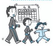 親子でジョギングカレンダーを作成し、ジョギングしたら○を付け、月ごとに成果を確認する。