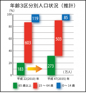 神奈川県の全⼈⼝に対する65歳以上の⾼齢者の割合は、平成22年の時点で約20%でしたが、全国を上回るスピードで⾼齢化が進んでいます。平成47年には30%を超え、実に3⼈に1⼈が⾼齢者となることが予測されています。(国⽴社会保障・⼈⼝問題研究所による推計)