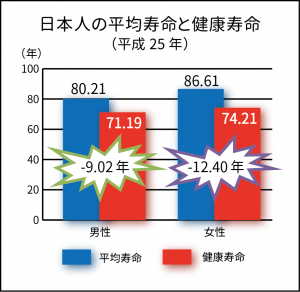 平均寿命のうち、健康で⾃⽴した⽣活を送ることのできる期間を「健康寿命」といいます。厚⽣労働省の調査によると、平均寿命と健康寿命の差は男性が9年以上、⼥性が12年以上となっています。これは、晩年、病気や衰弱で⼊院したり、介護が必要になったりする期間がおよそ10年もあることを⽰しています。健康寿命を延伸させることは、国⺠が健やかに⽣活し、⽼いることのできる健康⻑寿社会へとつながります。