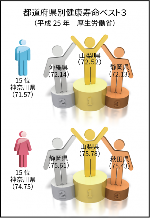 次に、本県の健康寿命の様⼦をみてみましょう。厚⽣労働省が算出した平成25年都道府県別健康寿命ランキングによると、神奈川県は男性が71.57年で全国15位、⼥性が74.75年で同15位となっています。いずれも全国平均は上回っていますが、決してトップ・クラスとは⾔えません。