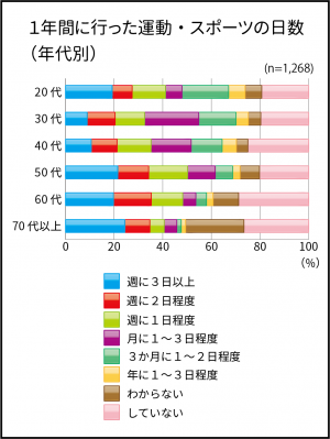県⽴体育センター(現:スポーツセンター)がまとめた「県⺠の体⼒・スポーツに関する調査結果報告書(平成27年度)」によると、1年間に⾏った運動・スポーツの⽇数が少ないのは、“30〜40代の成⼈の⽅々”ということがわかりました。