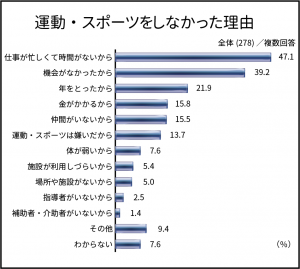 また、運動・スポーツをしなかった理由については、「仕事が忙しくて時間がないから」という理由が圧倒的に多く、次いで「機会がなかったから」という理由でした。