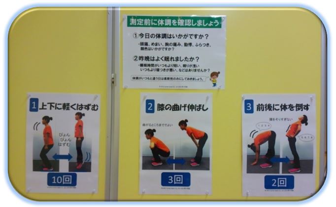 測定前に、自分の体調を確認し、スタッフと準備運動を行って、安全に留意して実施します。