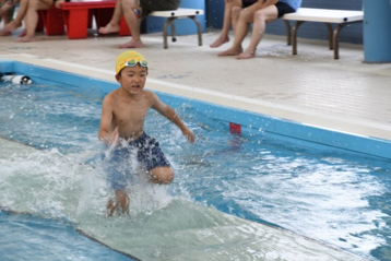 流水プール(全長20メートル)の水面に敷かれた長さ15メートル、幅0.9メートルのゴザの上を走り抜けます。1人2回走り、速い方のタイムで競います。バランスをとるのが難しく、途中でコースアウトすることもしばしば。(それも、また楽しいのですが)