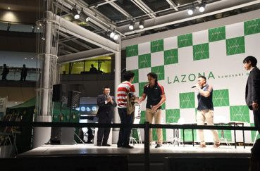 10月26日(金曜日)にラゾーナ川崎プラザ2階ルーファ広場(JR川崎駅西口)で、「ジャパンラグビーチャレンジマッチ2018日本代表vs世界選抜戦パブリックビューイング」が開催されました。この試合は、ラグビーワールドカップ2019(TM)日本大会を1年後に控えた日本代表の現状を確認するための大事な強化試合で、パブリックビューイングには会社帰りの方々や家族連れなどたくさんのラグビーファンが訪れ、東芝ブレイブルーパスの大野均選手、望月雄太氏、ラグビー解説多数の野澤武史氏の解説ととともに日本代表の熱い戦いを応援しました。当日は、試合観戦だけでなく、大野選手、望月氏、野澤氏によるトークショー、ハーフタイムにはゲストへの質問コーナーなどがあり、みなさんが楽しめるイベントとなりました。