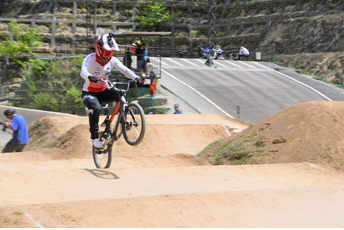 丹野選手の後ろにあるのがBMXコースです。スタートゲート完備、国内初のタイム自動計測システム(1000分の1秒まで計測可能)を導入、延長345メートルの設備の整った施設です。
