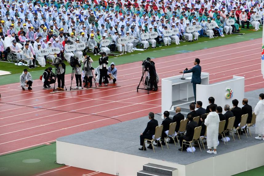 山口祥義佐賀県知事の開会宣言・大会会長挨拶。挨拶の内容が大型ビジョンに字幕で映されるとともに選手団の前では、手話で内容が伝えられました。