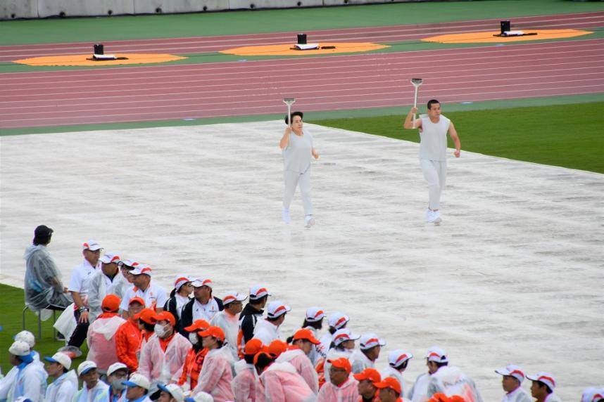 小雨が降る中始まった開会式ですが、オープニングプログラムのパフォーマンスで雨も消し飛び、選手が入場する時には雨も止みました!