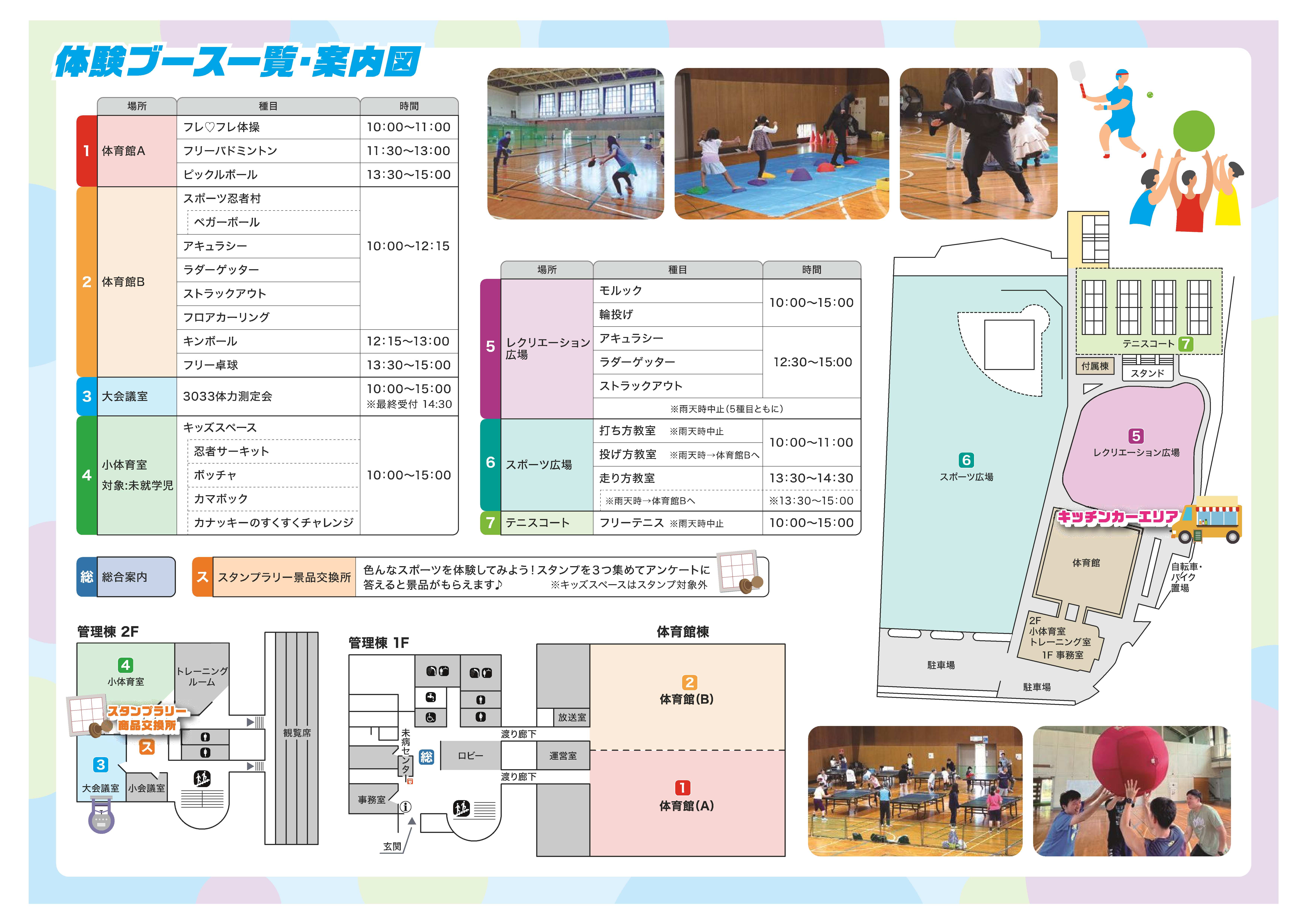 (1)スポーツ忍者村 ペガーボール (2)アキュラシー (3)ラダーゲッター (4)ストラックアウト (5)フロアカーリング (6)キンボール (7)フリー卓球 |