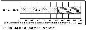 「村田芳子によるダンスの楽しさ・魅力に関する因子と項目」の質問を「はい」「どちらでもない」「いいえ」で集計して、事前と事後の比較をし、別に事後アンケートも行った。事前と事後の比較では、6割以上の生徒が「はい」と回答し、生徒は表現形式を取り入れたことや見せ合い、グループワークといった活動を通して、イメージをとらえて踊る楽しさや人に見てもらう楽しさ、人とかかわる楽しさなど、いろいろな楽しさを味わったと考えられる。また、事後アンケートの「踊る楽しさや喜びを味わうことができたか」の質問では、6割の生徒が「はい」と回答していることから、概ね生徒は踊る楽しさや喜びを味わうことができたと考えられる。(図3)