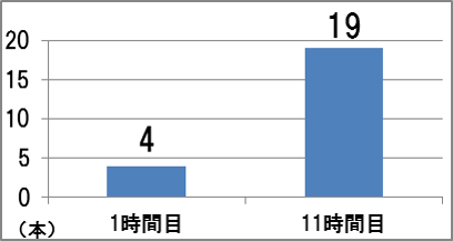 図4は2時間目と8時間目のハイクリア測定による結果を、飛距離別に人数を示したものである。2時間目の測定では9m未満が11人で最も多かったが、8時間目では11m以上12m未満が11人となった。これにより多くの生徒の飛距離が伸びたことが分かる。