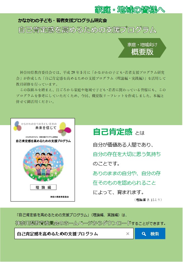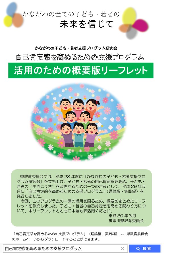 神奈川県教育委員会では、全ての子ども・若者の未来を信じて、そして、神奈川で生まれ、育った子ども・若者たちが、自己肯定感をもってほしいという願いのもと、「見つける→気づく→関わる」というプロセスからなるプログラムを平成29年5月に作成しました。かながわの子ども・若者を支援する皆様におかれましては、問題行動等の未然防止の観点から本冊子を御活用ください。