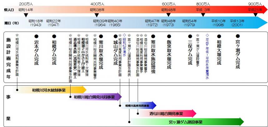 神奈川県における水源開発は、戦後復興・高度経済成長等による人口の急増や産業の集積による水需要の増大を背景として、大きな水不足を経験しながら行われてきました。
