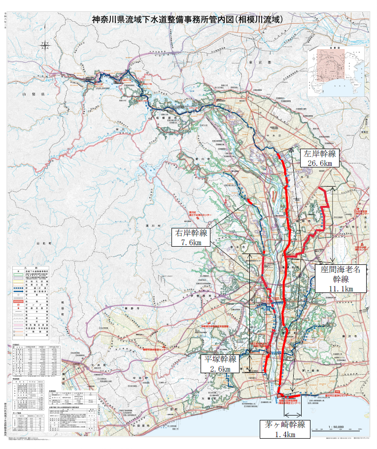 相模川流域下水道の管径2,000㎜以上の管渠(延長約58㎞) (点検箇所図参照) |