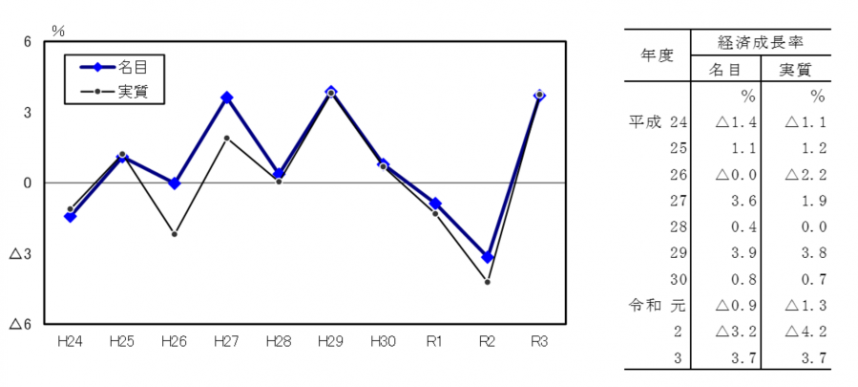 令和3年度の経済成長率は、名目・実質ともに3年ぶりのプラスとなりました。