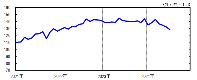 神奈川CI一致指数(2020年=100)は、128.9となり、前月と比較して5.7ポイント下降し、2か月連続の下降となった。